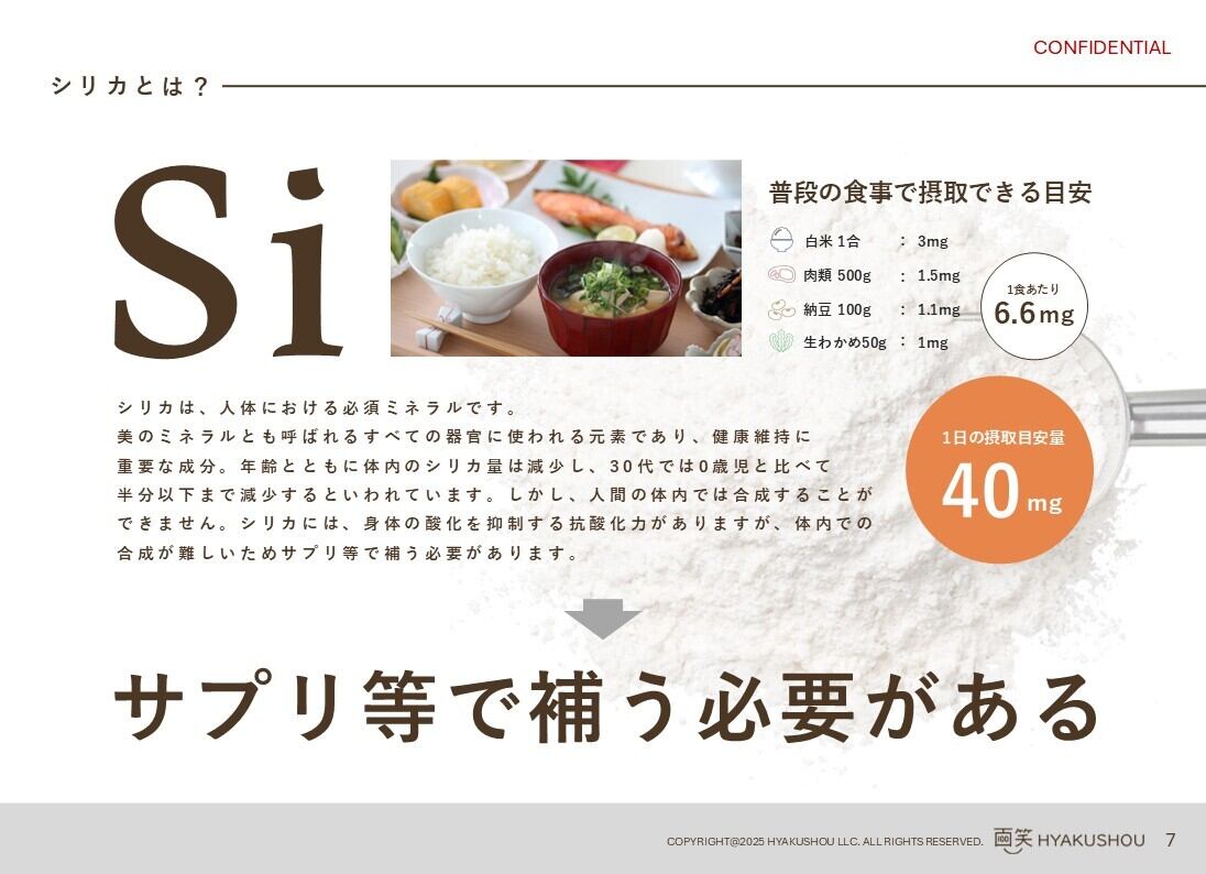 シリカは美容と健康維持に欠かせない必須ミネラルであり、加齢とともに体内量が減少していきます。しかし体内で合成できないため、日々の補給が必要な成分です。
