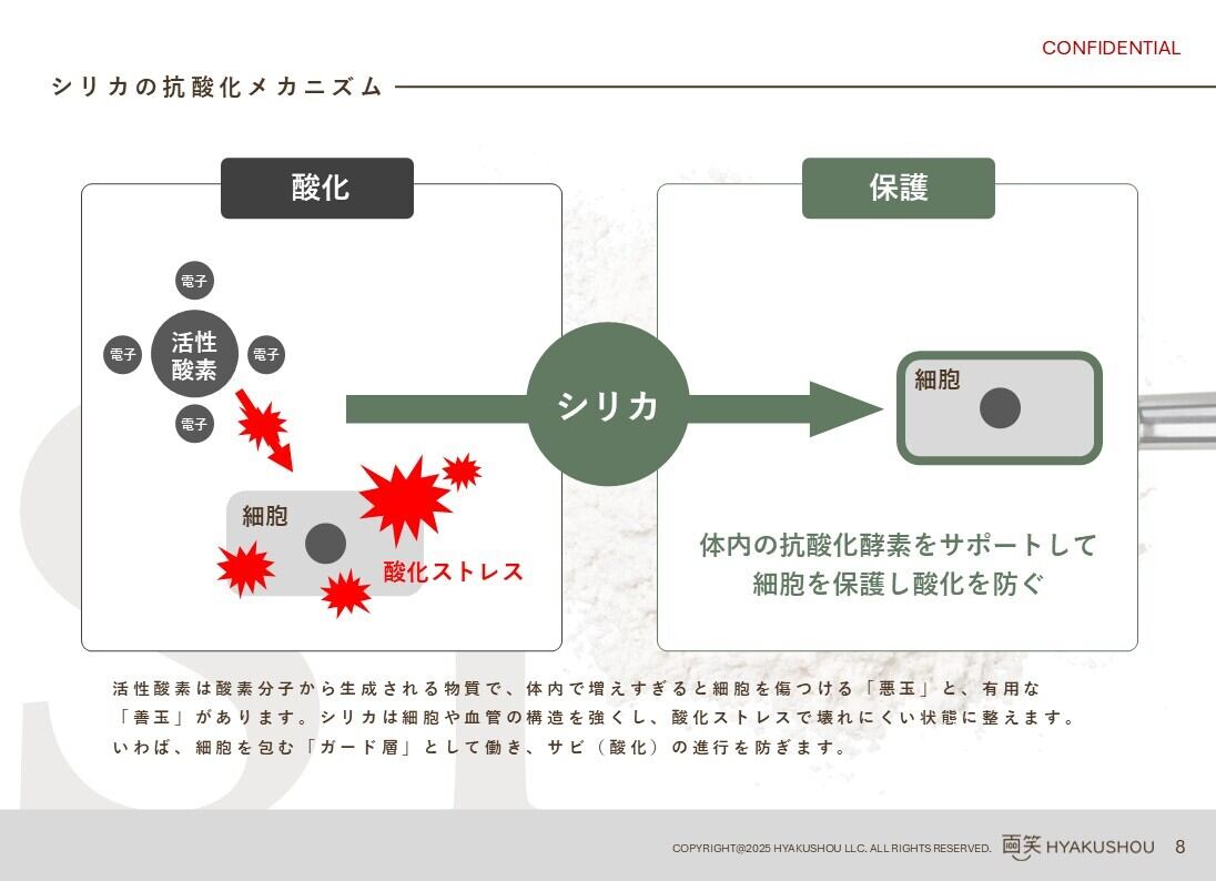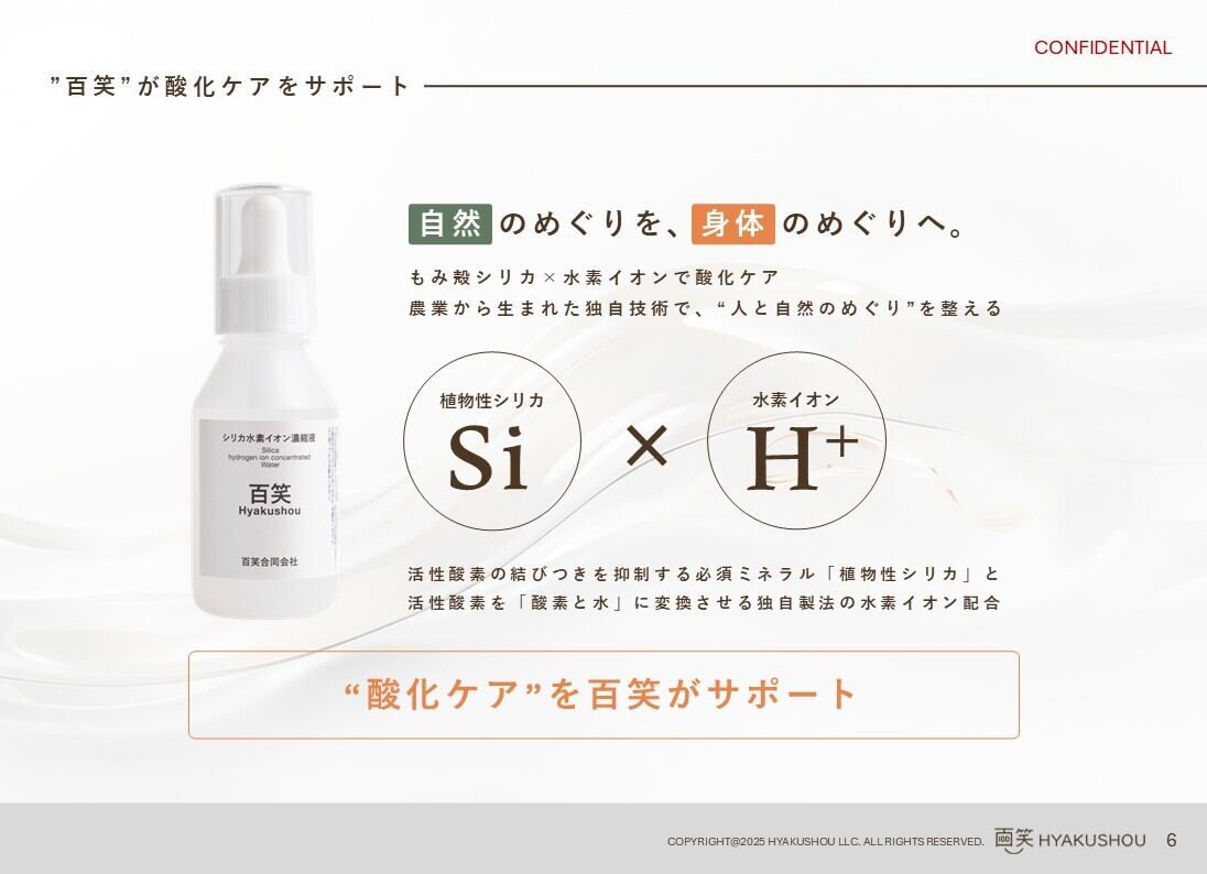 百笑の「シリカ×水素イオン濃縮液」は、そんな酸化ストレスに着目し、身体が本来持つ“めぐり”と“守る力”をサポートするために生まれたアイテムです。