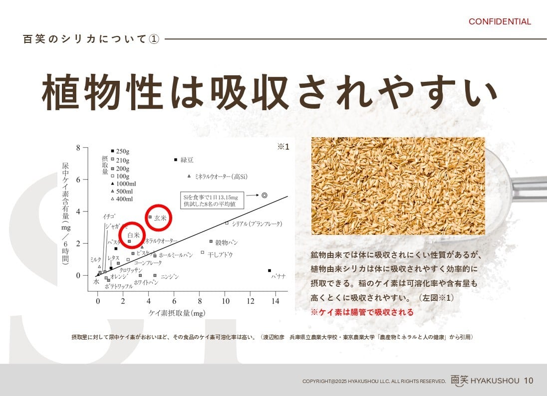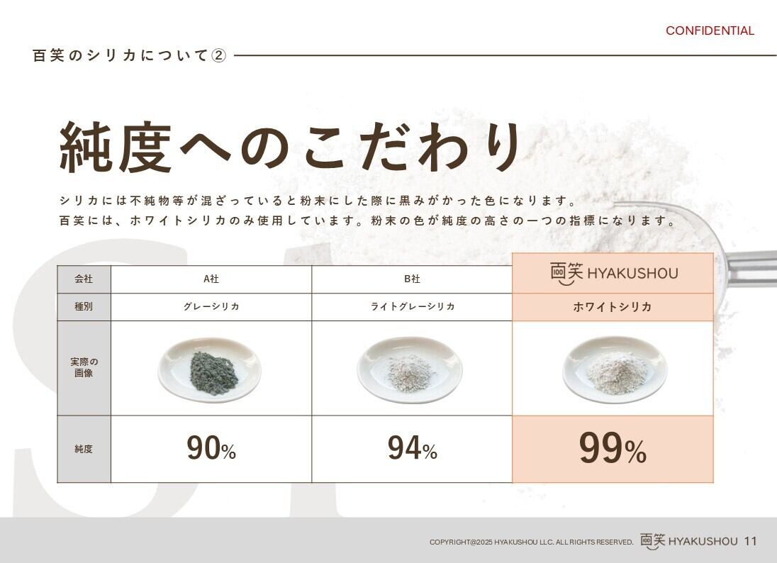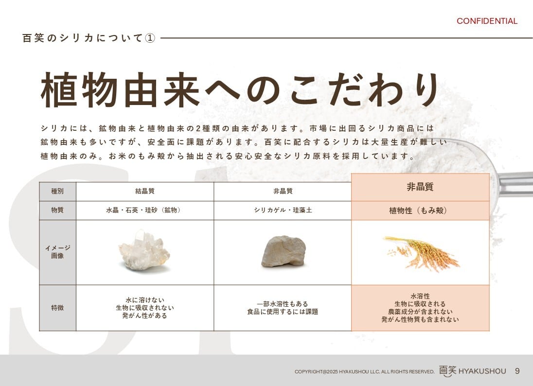 百笑では、農薬不使用・発がん性物質不含の、安心安全な“もみ殻由来シリカ”を採用しています。