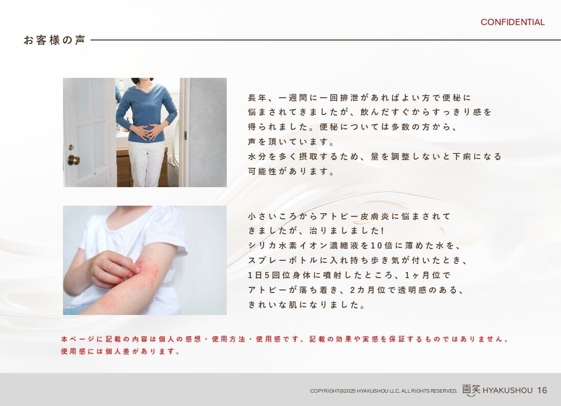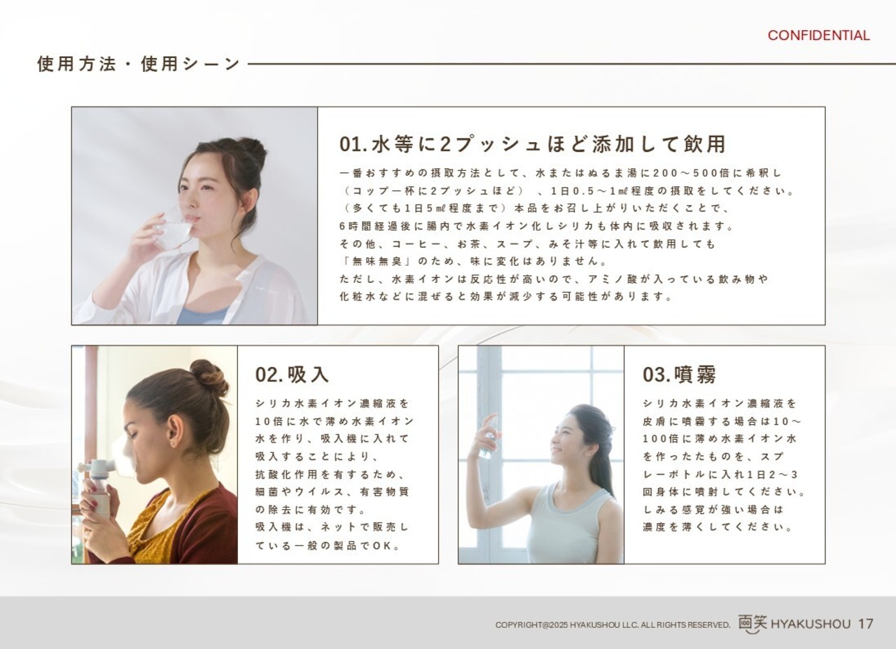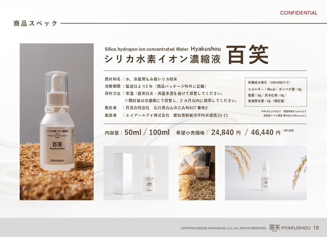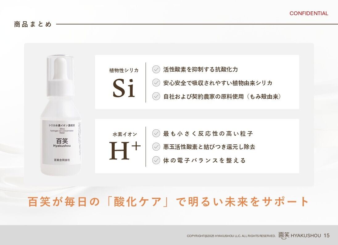 百笑が独自の農業技術から開発した「植物性シリカ」と「水素イオン(H⁺)」を組み合わせた唯一の商品。